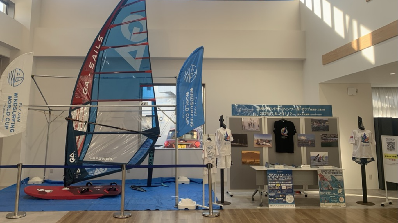 2023年の大会からは、ウインドサーフィンの実物や過去の大会の写真パネルを展示し、セイルの大きさやレースの迫力を通じて、大会をより身近に感じていただけるような取組を行いました。